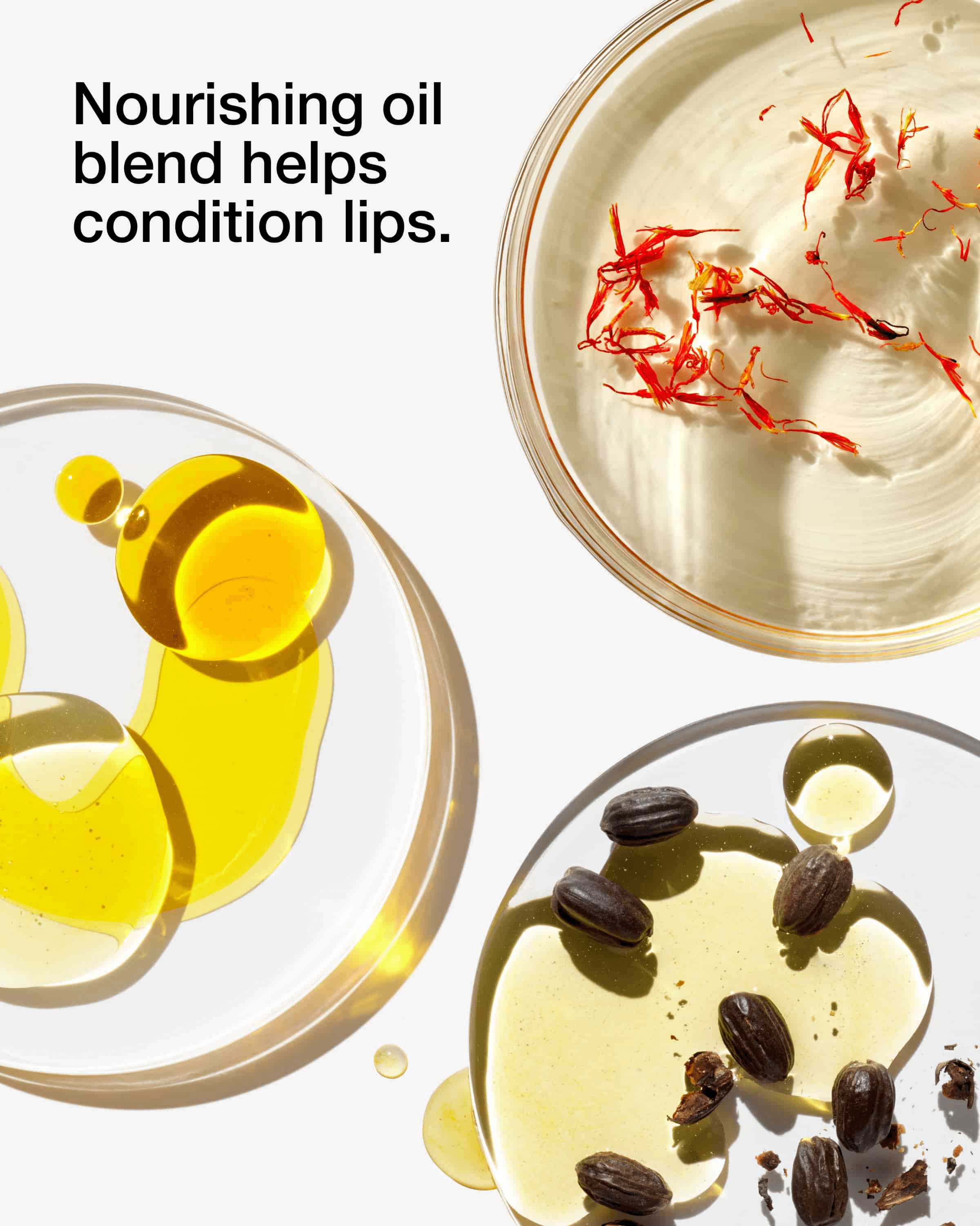 - Helps condition lips with a nourishing blend of oils: safflower oil, jojoba oil, olive oil, sunflower seed oil, and castor oil.