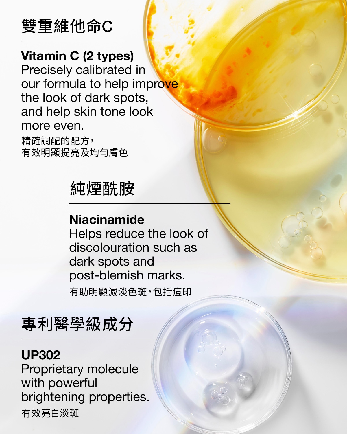全新升級第四代美白精華由皮膚科醫生研製,讓肌膚全方位透現無瑕鑽光。全新升級的配方蘊含專利淡斑成分UP302,同時加入抗炎舒緩成分,平衡更強效的美白活性成分。*經臨床實證,能對抗六種肌膚困擾打造更亮白肌膚,包括:色斑痘印、炎症後色素沉澱、膚色不均、泛黃、暗啞和毛孔粗大等問題。溫和配方適用於所有肌膚類型,包括敏感肌膚。